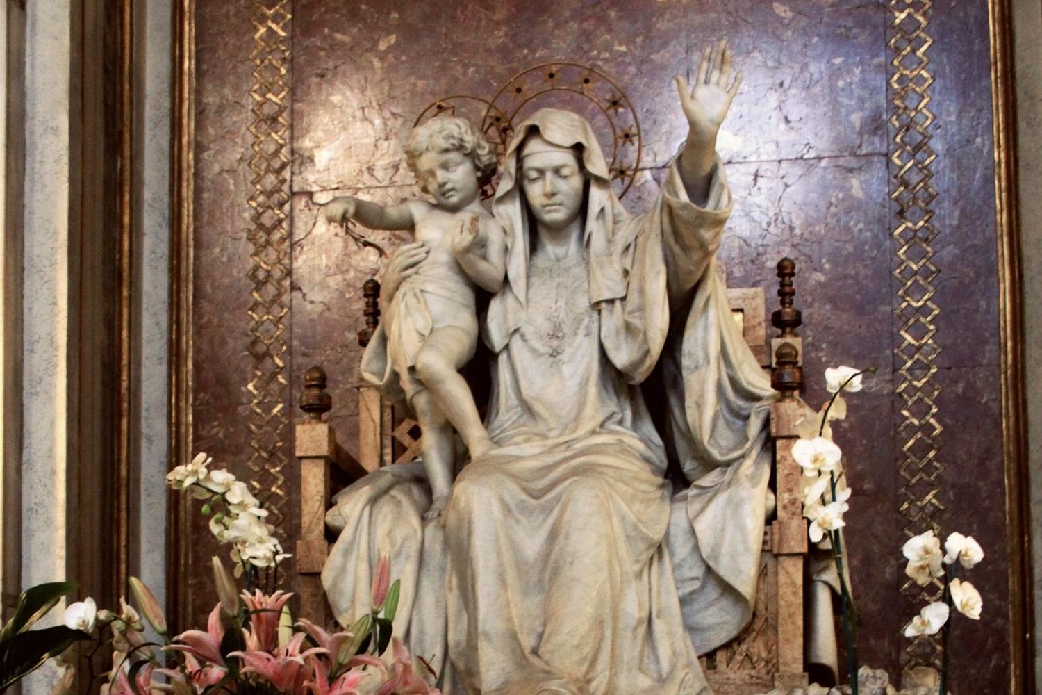 St. Mary Major is a treasury of works of art and artifacts of religious importance. One such work of art can be found to the left when one enters the nave of the church. Commissioned by Pope Benedict XV in thanksgiving for the end of the First World War and completed by Roman artist Guido Galli in 1918, a marble statue of Mary enthroned is perched high against the wall. Beneath the statue is the simple inscription, “Ave Regina Pacis” – “Hail, Queen of Peace.”